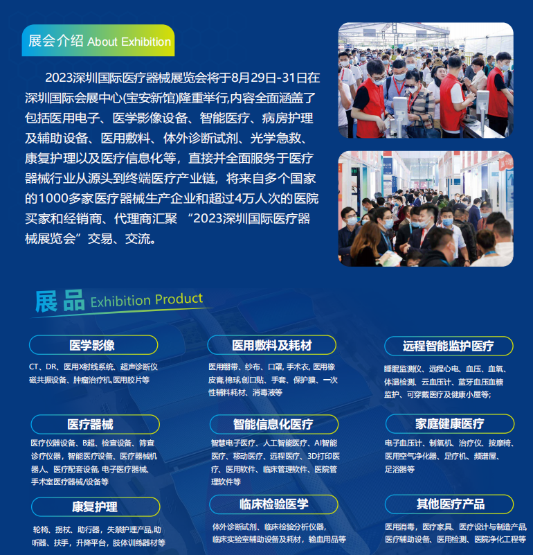 2023深圳国际医疗器械展览会将于8月29-31日在深圳国际会展中心隆重举行,内容全面涵盖了包括医用电子、医学影像设备、智能医疗、病房护理及辅助设备、医用敷料、体外诊断试剂、光学急救、康复护理以及医疗信息化等,直接并全面服务于医疗器械行业从源头到终端医疗产业链。